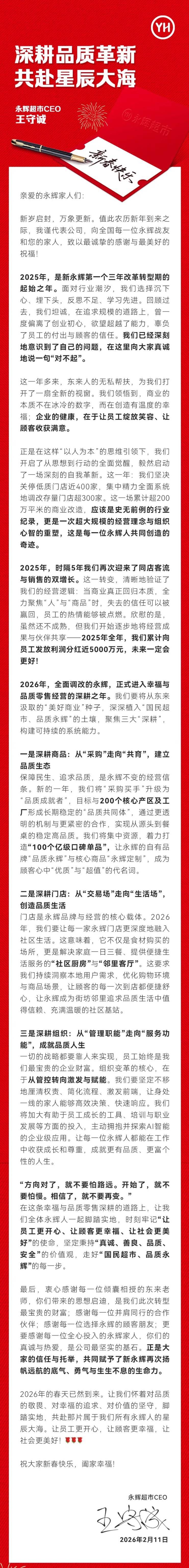 【大河财立方消息】2月11日,永辉超市CEO王守诚发布2026新春寄语,总结了过去一年的调改成果,同时确立2026年的经营目标。